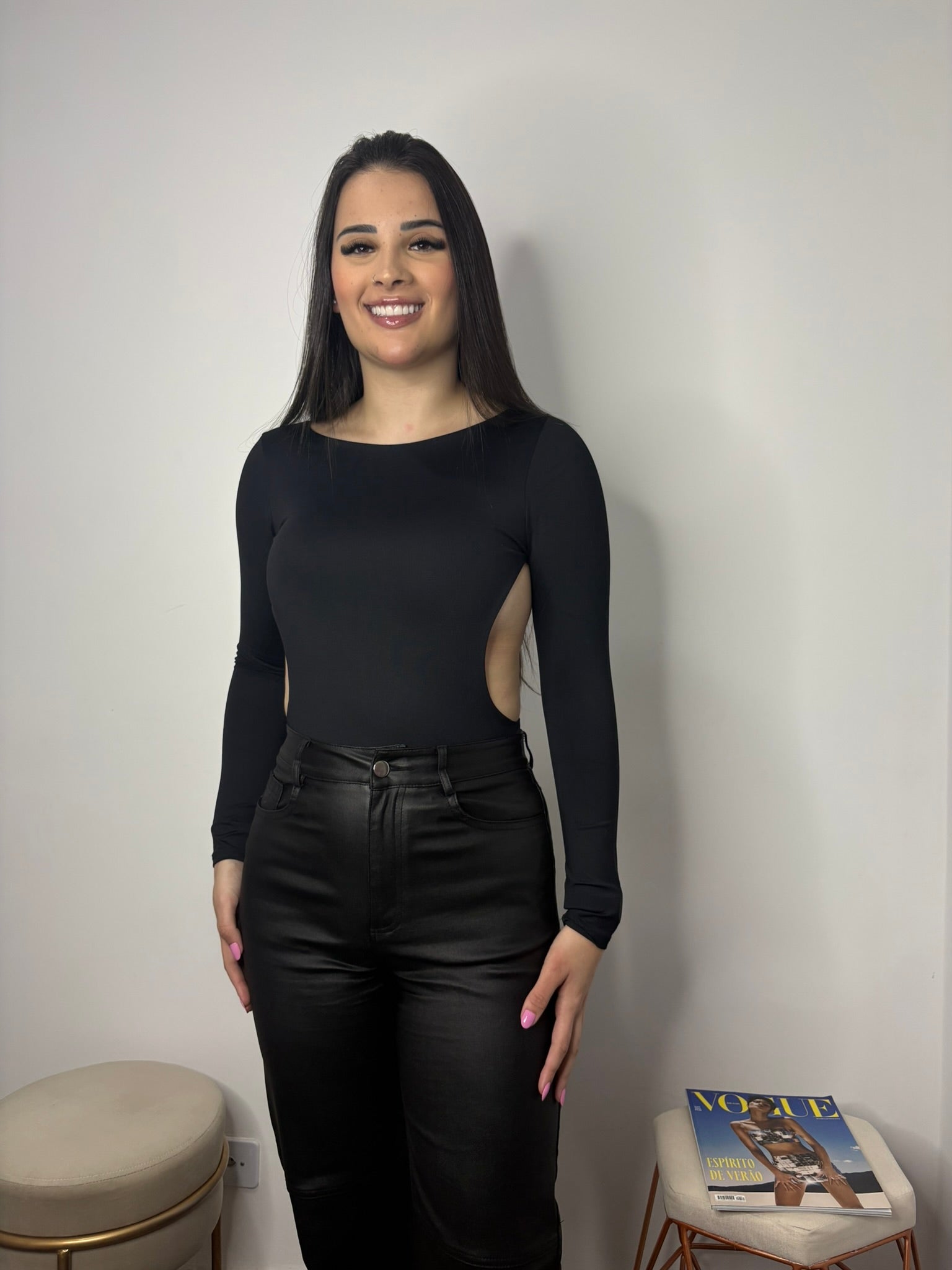 O Body Romana é a escolha perfeita para quem quer unir sofisticação e ousadia. Com mangas longas que trazem um toque refinado e um decote aberto nas costas, ele valoriza a silhueta de forma elegante e moderna.